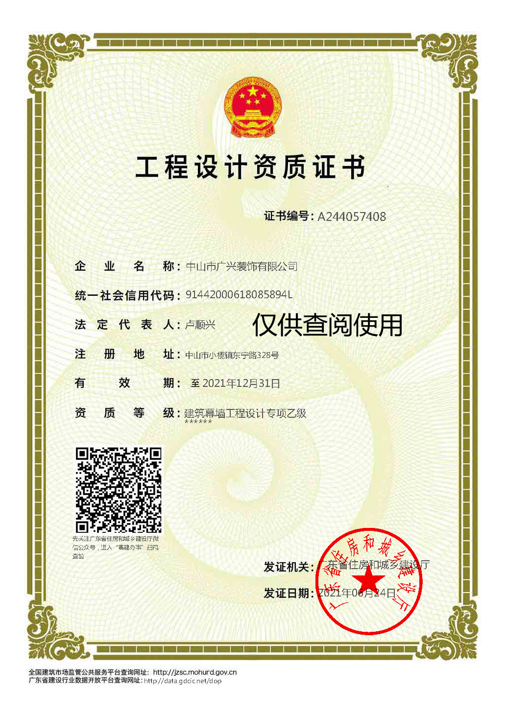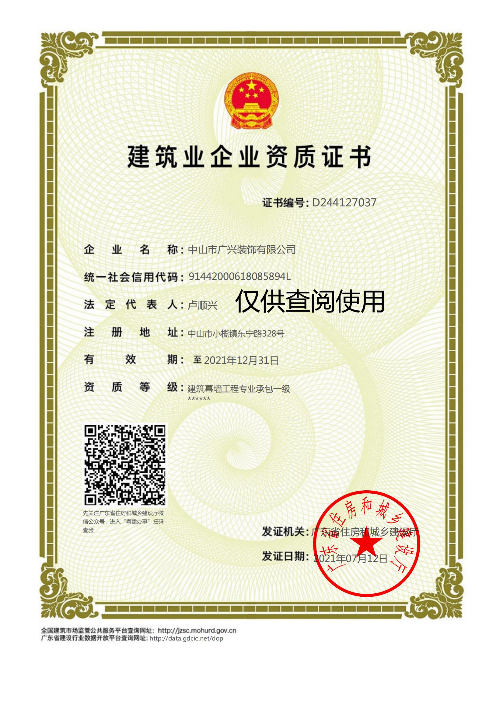 中山市廣興裝飾有限公司創(chuàng)建于1985年,是一家集鋼結(jié)構(gòu)、建筑、幕墻、裝修裝飾、鋁合金門窗專業(yè)的設(shè)計(jì)、加工及施工安裝為一體的大型綜合性建筑企業(yè)。公司總部位于中山市小欖鎮(zhèn),在中山和珠海均建有生產(chǎn)加工基地,總占地面積60000多平方米。